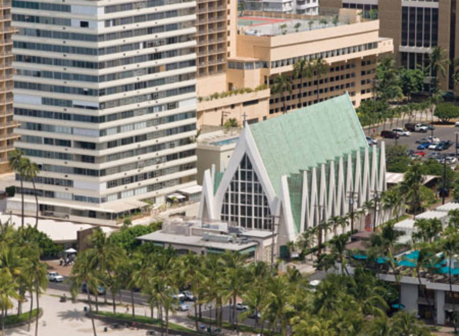 The current Mid-century Modern Church structure was designed by architect George W. McLaughlin in 1961 and the church blessed by Bishop James Sweeney on August 16, 1962. The dramatic exterior, dominated by the copper-clad roof, is very visible in Waikiki, despite having a two-story commercial building in front of it on Kalakaua Avenue. The building is a structural hybrid: Exterior concrete inverted “V” shapes each frame a stained glass window. The inverted “V” theme, symbolic of hands in prayer, continues inside, with plastered steel beams forming the primary structure, between which are wood plank ceilings. There are no traditional wall mounted Stations of the Cross within the structure; the stained glass serves that purpose.