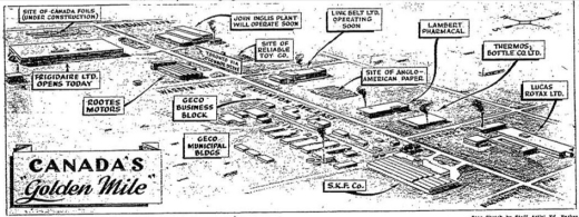 The seeds for imagining and branding the corporate campus can be seen in the initial advertising campaigns and sales pitches staged by developers and municipalities, like the City of Toronto. These campaigns were hoping to capitalize on the Americanization of the postwar suburban fantasy and its Canadian apparition, while simultaneously encouraging the industrial growth needed to achieve the economic prosperity desired. This growth remains a defining characteristic of this part of the city, as opposed to others that are free of all signs of industrialization.