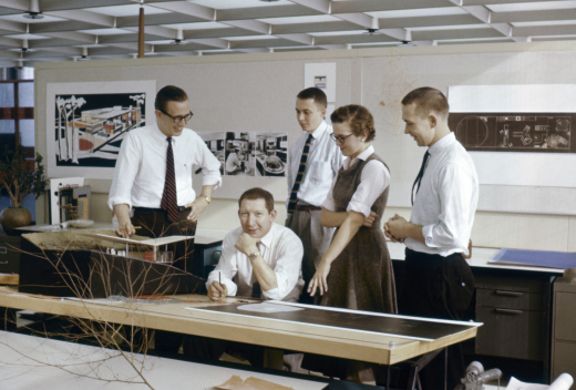 The Design complex was the final portion of Saarinen’s design to be completed, with employees still moving into the new quarters at the time of the dedication. Photographs from early 1956 reveal the installation of finishing touches like textiles, artwork, and furnishings.