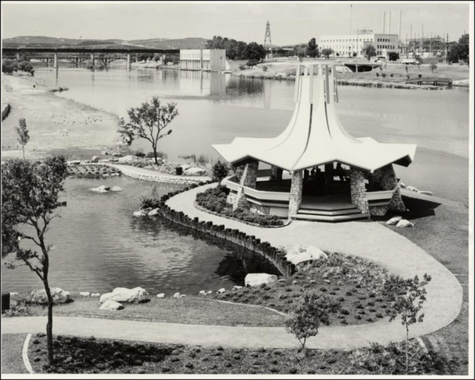 The gazebo was the first structure built along the shoreline after the lake was created by the construction of Longhorn Dam in 1960.3 Initially formed as a reservoir to cool the Holly Street Power Plant, Town Lake, as it was named, began to be given serious consideration for its development as an asset to the City and its citizens. Although Lady Bird Johnson was not involved with the planning, fundraising or building of the gazebo, the project is associated with her national beautification initiative as First Lady.