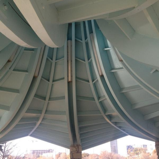 While California boasted the style’s beginnings, Googie architecture was a national phenomenon and made its way to Texas. Googie is characterized by boomerang and amoeba shapes; atomic shapes based on the atomic model; buildings resembling spacecraft and exposed steel beams, to name a few.13 Googie was at its peak in 1965 when NAWIC introduced its concept of a gazebo to the City of Austin. The gazebo’s hyperbolic paraboloid roof also contains elements known as shell construction. Shell construction’s concrete walls and roofs have few structural columns and can span significantly in relation to the structural support. However, Googie is not a term recognized by Mrs. Nill and the roof of the gazebo was originally made of glue-laminated (glulam) materials.14