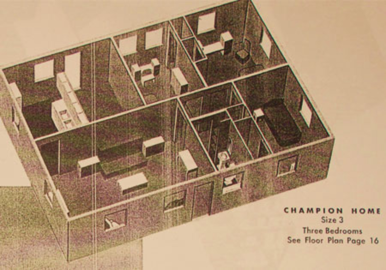 “Champion Home Size 3” one of the floor plans produced by Gunnison. This one is a three-bedroom plan. (From original Gunnison sales material)