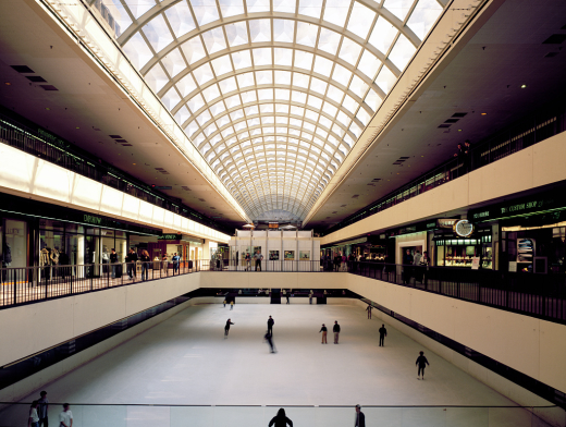 Both the Houston and Dallas Gallerias were designed by architect Gyo Obata, a founding partner of St. Louis-based giant HOK. Like Hamilton, Obata began his career in the office of Minoru Yamasaki, and was similarly inclined to a restrained modernism of raw materiality. (DFW International Airport is another of his Dallas-area projects.) The Galleria’s namesake and inspiration was the Galleria Vittorio Emanuele II, in Milan, an 1861 masterpiece of glass-roofed arcades that converge at a giant glass dome. Obata borrowed those arcades, reinventing them as glazed barrel vaults over a multistory, enclosed environment. The centerpiece was an ice-skating rink. It suggested a new direction for the mall not just as a retail environment but as a total entertainment destination.