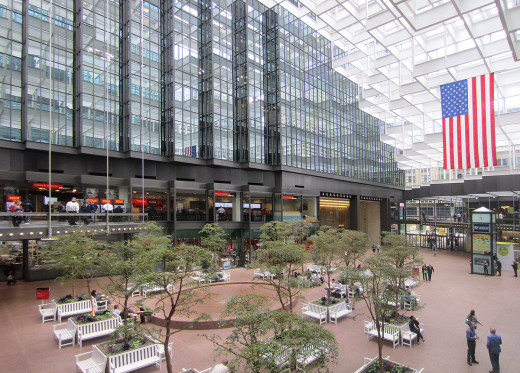 Johnson also broke from the standard-issue box skyscraper, articulating the curtain wall at the corners, creating steps—which he called “zogs”—where the deep horizontal lines of the mullions intersect at 90 degrees. The corner creates a fractured array of reflections and lends a scale to the building through subtle angularity, and has the added benefit of producing 32 corner offices per floor. In addition to the aesthetic contrast to the typical curtain wall, Johnson’s heavier-than-usual vertical mullions were also meant to serve as a support for custom window washing rigs. This heft has benefited the curtain wall to better withstand the winds and temperature changes of Minnesota’s climate. This simple move may be the major reason why recent wind-load and leakage tests revealed that the IDS curtain wall is performing extremely well. These and other refined, but expressive design elements became the coalescence of ideas in the creation of the IDS Center, to which Johnson exclaimed, “I think it is our best building.” (The Philip Johnson Tapes, 177).