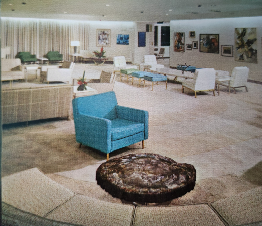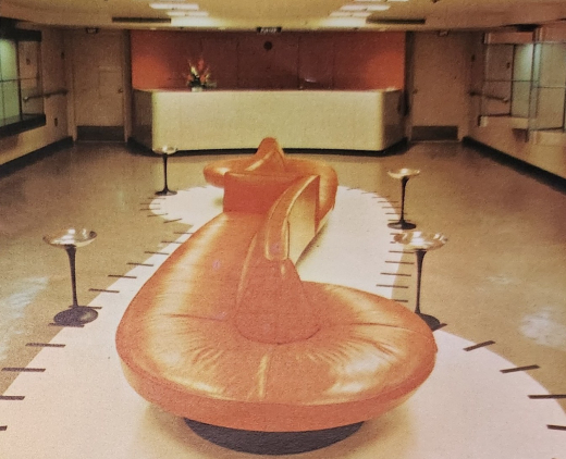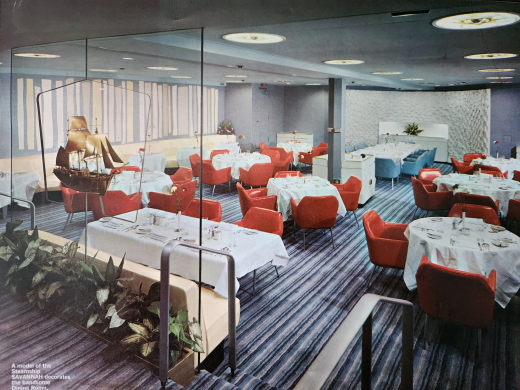 Modern artwork also played a key role in the ship’s aesthetics; both permanent and loaned displays of artwork were showcased. Of the permanent displays, perhaps the most prominent is the “Fission” hyperboloid mural by Pierre Bourdelle, located in the Dining Room behind the captain’s table, and it and remains on the ship today. Original prints, etchings, woodcuts, abstract color photography, and ceramics hung in passenger and officers’ staterooms. The Whitney Museum of American Art loaned fourteen paintings which were displayed in the main lounge for passengers and visitors to enjoy.