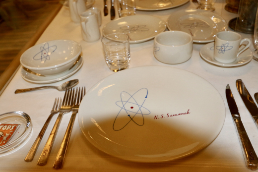 Atomic and futuristic motifs featured prominently throughout the ship; in the light fixtures in the dining room, the China service, floor tiles in the main stairwell, and on the tabletops in the veranda and cocktail lounge. In addition, these tables featured electroluminescent displays, which have recently been restored by the non-profit N/S Savannah Association, and once again light up like they did when the ship was in service.