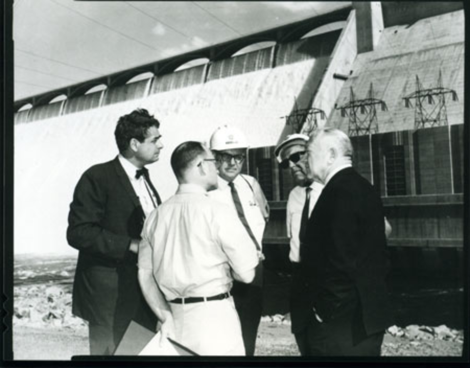 Photo (left): Photographic copy of photograph, H. S. Holmes, photographer, June 27, 1968 (original print located at Grand Coulee Power Office, Grand Coulee Dam, Washington). “Discussing the architectural design of the Third Powerplant and surrounding area from left are: Mr. Hamilton Smith, Marcel Breuer Associates, New York; Mr. Kenneth Brooks, Spokane Architect; Mr. Harold Arthur, Denver USBR Office; Mr. Otis Peterson, Assistant to the Commissioner-Information, Washington, D.C.; and Mr. Marcel Breuer, Architect, New York.”