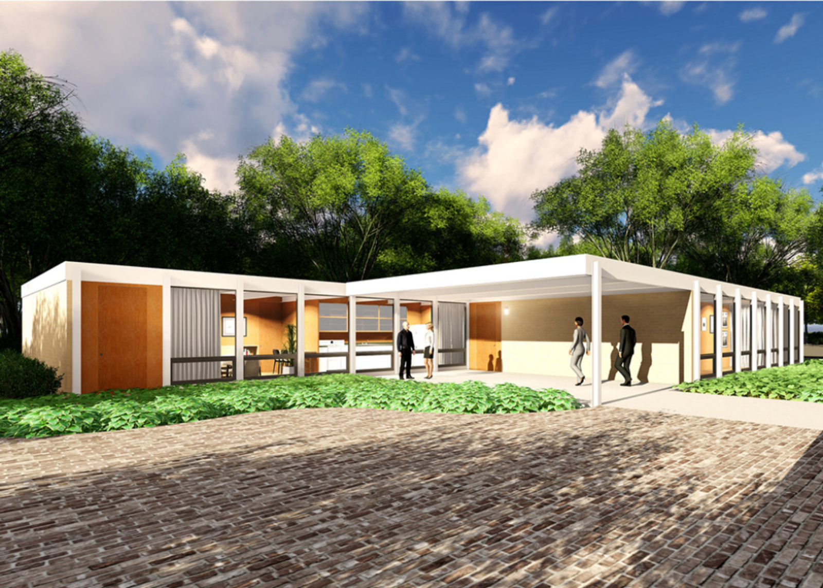 (February 20, 2018) The Elmhurst Art Museum proudly announced today that the highly anticipated restoration of the original facade of Mies van der Rohe’s McCormick House (1952) will be unveiled in June 2018. The iconic carport entrance of this historically significant building -- one of only three singlefamily houses built by Mies in the U.S. -- will be visible for the first time in more than 20 years, having been obscured by an addition connecting it to the Museum since 1997. Elmhurst’s Heritage Architecture Studio is working with Elmhurst Art Museum Executive Director John McKinnon to oversee the historic preservation by Berglund Construction. This unveiling marks a major transformation of the house, and one part of a multi-phase restoration plan which will continue with the interior at a later date.