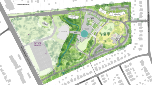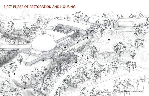 A case study for other postwar synagogue designers, Park Synagogue is now becoming an important precedent in the preservation and adaptive reuse of Modernist sacred places. In 2005, after a half-century of use, the congregation moved five miles down the road to a new campus, Park Synagogue East. In 2021, the congregation sold the original 28-acre Cleveland Heights campus to Sustainable Community Associates (SCA), a local real estate development firm. SCA’s proposal for a multi-phase redevelopment project entitled Park Arts centers on an arts and culture hub, much like the adaptive reuse of Mendelsohn’s B’nai Amoona synagogue outside of St. Louis (now the Center of Creative Arts) and Temple Tifereth-Israel in Downtown Cleveland (now the Milton and Tamar Maltz Performing Arts Center for Case Western Reserve University). SCA formed Friends of Mendelsohn, a nonprofit, to own the original Mendelsohn buildings and steward the non-profit components of the larger redevelopment. Recently, SCA announced that Oberlin College and Conservatory’s new BFA in Integrated Arts will become the project’s anchor tenant. New housing is set for the perimeter of the site.