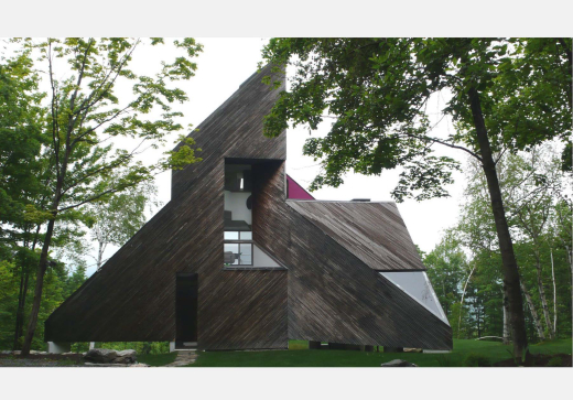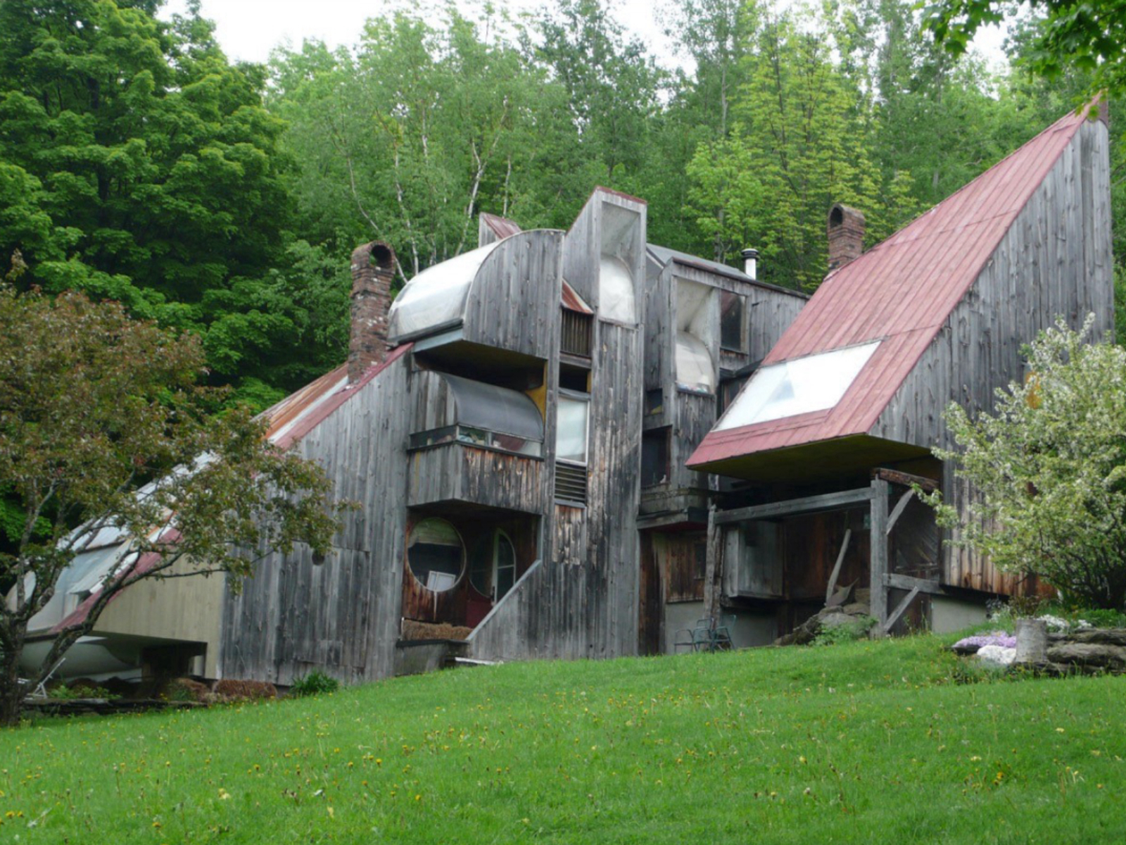 Today you can still find examples hidden in the hillsides above East Warren. One stand-out example is called The Dimetrodon. [Figure 1] It was built by students from Penn who ultimately went on to become leaders in the field of energy efficiency and green design. If you are polite, you can see this inspired collage of an early co-housing condominum from the driveway right off Dimetro Road. [Figure 2] Nearby, also viewable from the road is an accretion of volumes that grew out of the original Tack House, which was one of the first Prickly Mountain experiments. [Figure 3] Further up the hill take a left onto Loop Road. If the leaves are down for the season you will be able to see some exciting architectural forms appearing out of the woods. The best of the bunch is the Sibley/Pyramid house, about halfway up Loop Road on the left. [Figure 4]