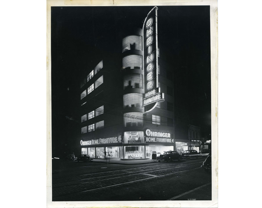 Betty Abrams was one of four children of Abe and Helen Ohringer, who had immigrated to the mill town of Braddock, Pa. in the early 20th century from Eastern Europe. The Ohringers ran a successful furniture store in Braddock with branches in several neighboring small towns. As the operation grew, the Ohringers built an eight-story headquarters along the main street of Braddock in 1941, designed in the Moderne style with a curved front of large glass block windows. It was the most architecturally current building in the small mill town. It is currently being restored as artist residences.