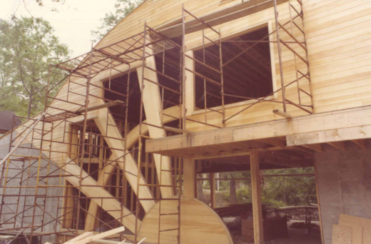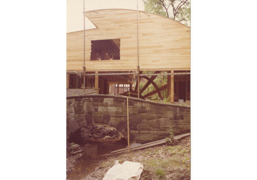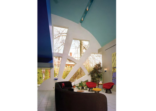 After meeting with several leading national architects including Michael Graves, the Abrams hired Venturi, Rauch & Scott Brown. Robert Venturi seems to have been inspired in his design by an old stone bridge left at the back of the small lot. The house mimics the curve and the scale of the bridge, but it adds a jagged angle to the roofline and the glow of pinwheel windows radiating into a starburst design across the wood-paneled façade. Construction finished in 1982. The Abrams gradually furnished the house with aesthetically appropriate décor and art, including Memphis Group furniture and a wall-sized print by Roy Lichtenstein, as well as smaller works by Warhol and others.