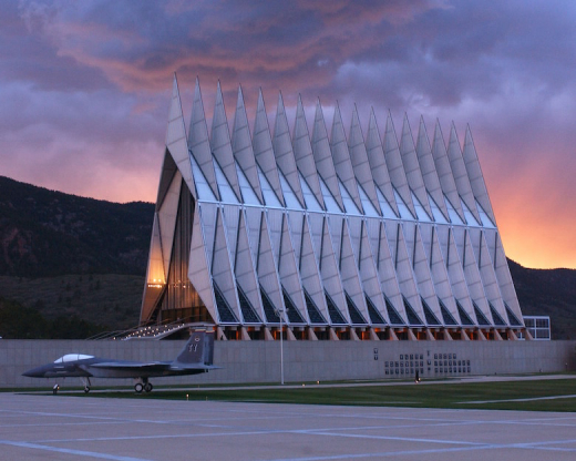 On July 23, 1954, Skidmore, Owings and Merrill (SOM) was awarded the contract to design and construct the United States Air Force Academy in Colorado Springs. The site itself was chosen from over 580 submissions by a Site Selection Committee that included Reserve Brigadier General Charles A. Lindberg, while over 300 architectural firms applied for the commission – one of the largest government construction projects of the Cold War era. Constructed during Eisenhower’s presidency, the Air Force Academy was intended to complement the established military academies at West Point and Annapolis.(1)