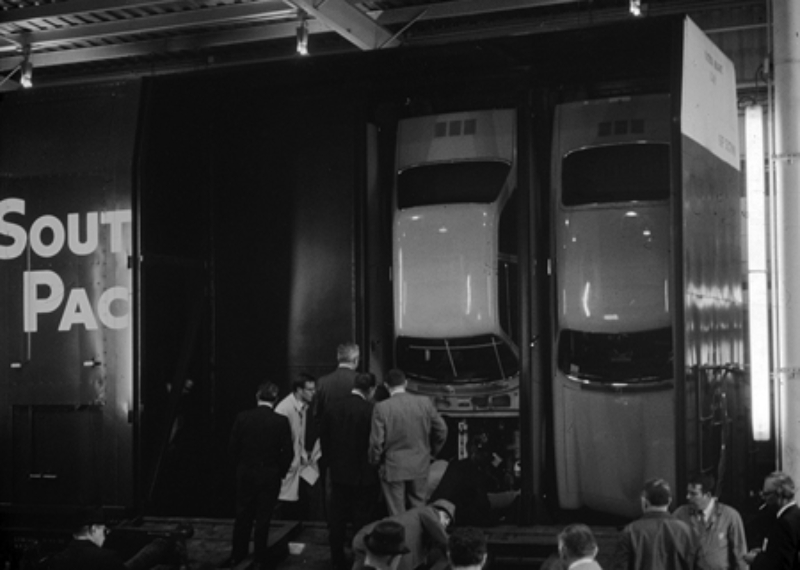 The Vert-A-Pac was an entirely functional design whose operation border-lined on performance. The functionalism of the design exploited this unabashed reorientation and celebrated the efficiency and the spectacle of the dismount. Each side of the railcar was modularly designed in five equal doors hinged at the base and enclosing three ‘parking’ spaces each. The doors were equipped with sockets that accepted frame bolts installed on the chassis of the Vega, allowing the car to be held in place by its own weight. Chevrolet’s PR department summarized the innovative dismount to simply ‘hav[ing] a car that could be started and driven off the door without preparation at the unloading point’. The engine, battery, oil baffle, carburetor, and the washer fluid reservoir of the Vega were designed to accommodate both a vertical and horizontal orientation and the transition from one to the other. The team was intent on the expectant ‘parents’ being able to drive their sub-compact straight from delivery.