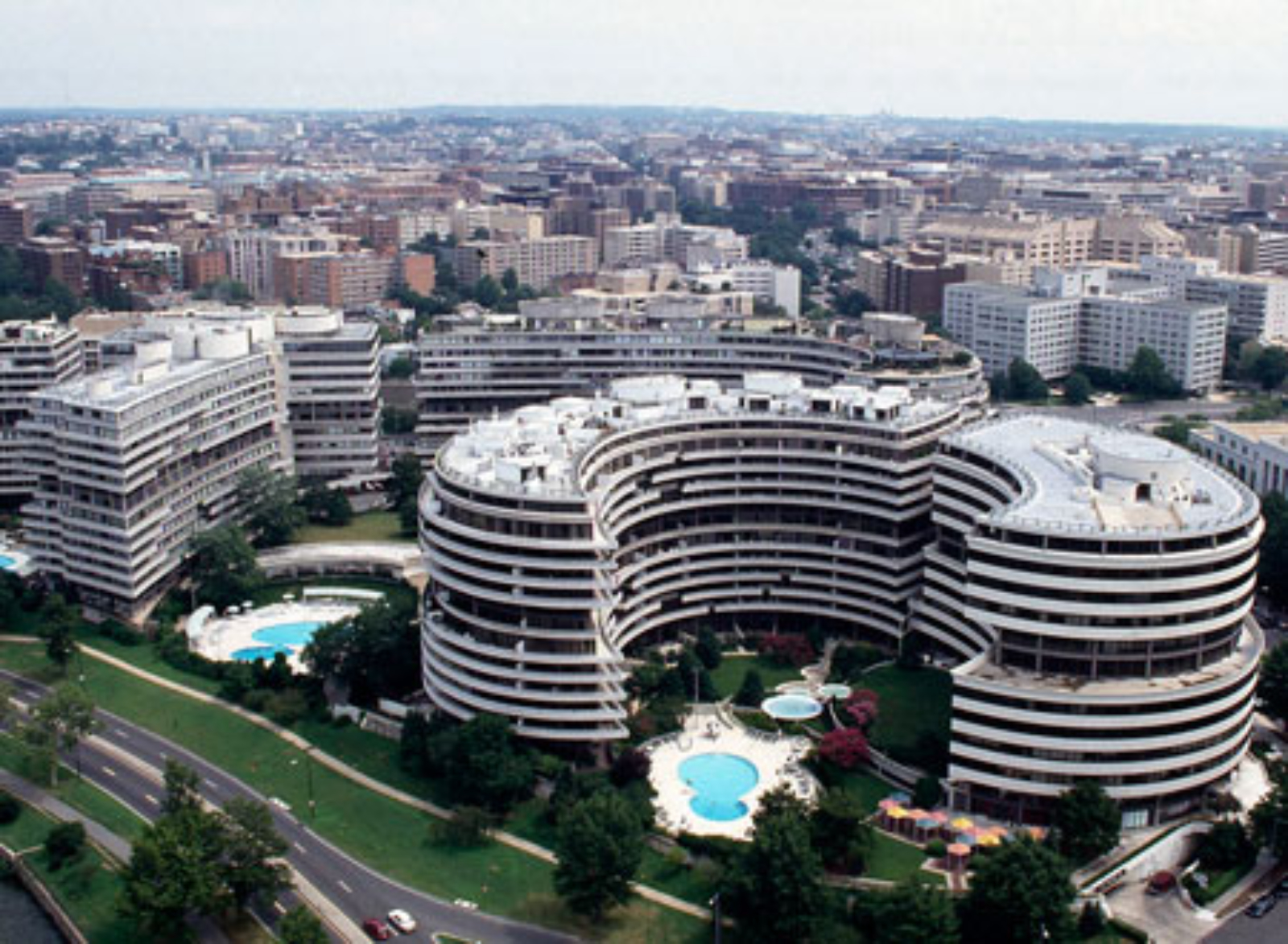 Watergate West opened in 1969 and Watergate South – the final building -- in 1971. (That same year, the John F. Kennedy Center for the Performing Arts opened next door. It’s now the busiest such venue in America, and one of the leading arts centers in the world.) Protecting the high-end tenants was the latest electronic security system, backed by round-the-clock staff. At two a.m. on June 17, 1972, one of those watchmen changed history when he spotted a lock held open with masking tape in a Watergate office building. Police arrested five intruders in the sixth-floor headquarters of the Democratic National Committee. What Richard Nixon's press secretary dubbed “a third-rate burglary” ended with the president’s resignation. The suffix “-gate” would become shorthand for political scandal.