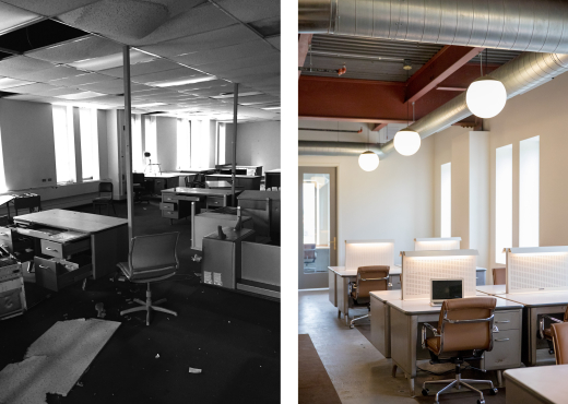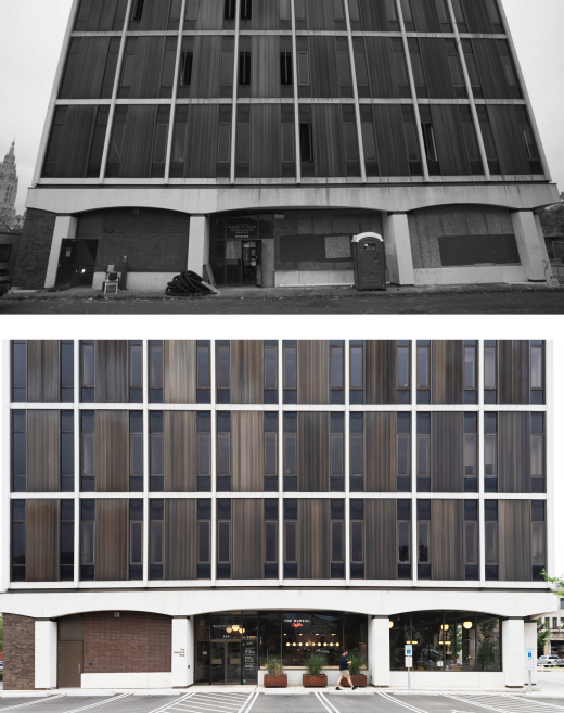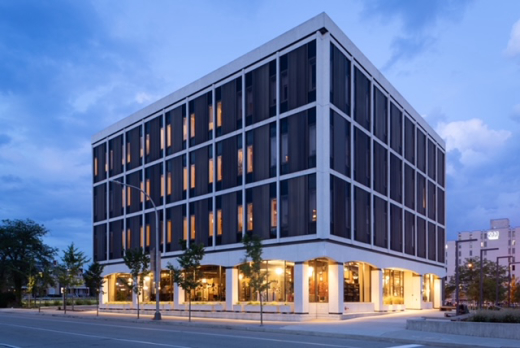 The jury awards a Design Citation of Merit for the restoration of the Detective Building, a prominent example of New Formalist architecture in Pittsburgh, PA, designed by Larson & Ludwig for the American Automobile Association in 1972. Sited within the East Liberty neighborhood, where a failed urban renewal project of the 1960s displaced residents and disconnected the street grid, the project team focused on creating a pedestrian-friendly plaza with green space, increased tree cover, a raingarden, bike parking, and precast concrete planters original to the building. For the building itself, much of the original materials and finishes were salvaged through reuse and repair. The existing steel frame was maintained, and exposed, precast façade panels were cleaned and repaired, existing concrete floors were polished and sealed, and envelope and energy efficiency improvements were incorporated. Once on the cusp of demolition, this 37,000 sq. ft. building is now an anchor of the neighborhood block.