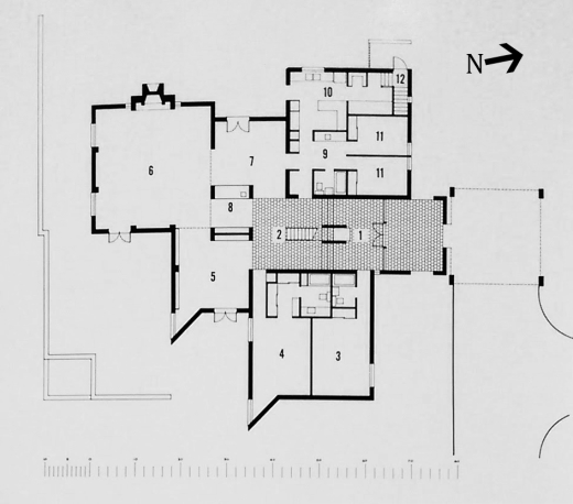 Dorothy Shipley White Residence plan: 1) entrance hall, 2) up to studio, 3) guest suite, 4) master bedroom, 5) study, 6) living room, 7) dining room, 8) cocktails, 9) pantry, 10) kitchen and laundry, 11) servant rooms, 12) down to basement.