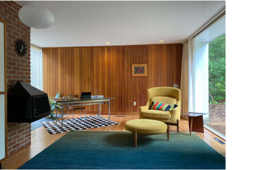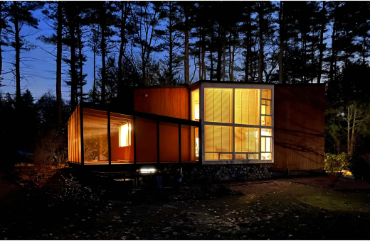 A Residential Design Award of Excellence is given for the restoration of the Schwann House and Studio, completed in 1947 by Walter Bogner, who played a key role in bringing Modern architecture stateside and shaping New England's midcentury architectural landscape. Commissioned by William Schwann, renowned musician and publisher of the Schwann Catalog, the property was incorporated into the Lincoln, MA historic district in 2022. The Schwann House epitomizes Bogner's architectural brilliance, blending simplicity and functionality, with large windows blurring the lines between indoor and outdoor spaces. A notable feature is Bogner's innovative window frame profile, central to the restoration's focus, reflecting his commitment to form and function. The layout, characterized by a stone fireplace and captivating sculptural elements, creates an inviting ambiance for live music and refined living. The restoration aimed to return the house to its 1948 state while preserving the original floor plan, millwork, hardware, and fixtures, and introducing subtle modernizations. Key changes include added bathrooms and improved connectivity between spaces for enhanced livability without compromising the original design. Bogner’s original color palette was painstakingly revived, drawing inspiration from nature and the site's organic hues.