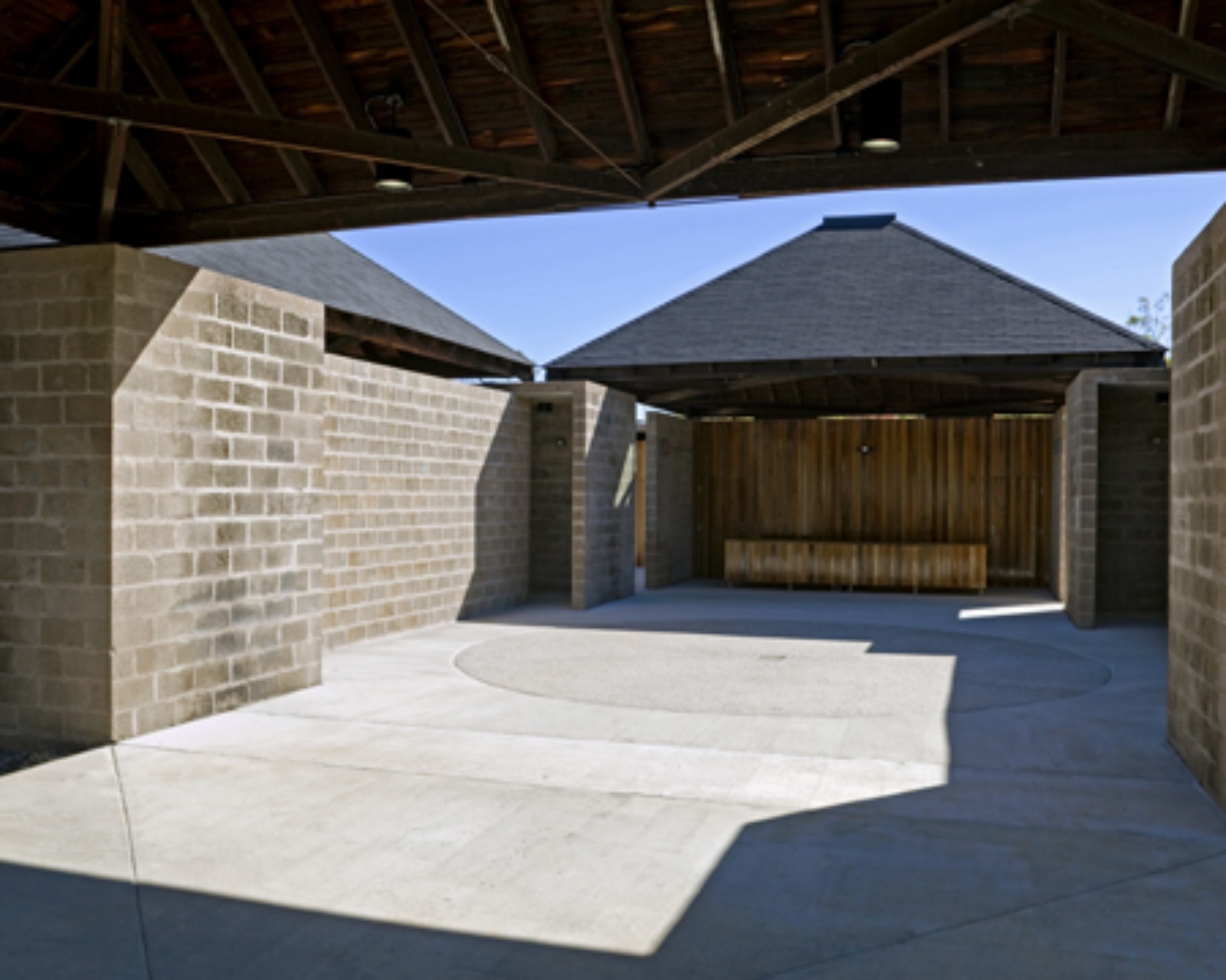 In 1955, the Jewish Community Center of Trenton commissioned Louis I. Kahn to design its new suburban facility in Ewing, NJ. The master plan included a pool complex with two pools and changing rooms; a day camp facility; a community center; and playing fields. The pool complex, now known as the Trenton Bath House, was the first piece to be constructed, opening in the summer of 1955. Kahn selected cost-effective materials including CMU, wood roof framing, and asphalt shingle roofing for the four structures in the nine-square grid of the plan.
