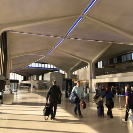 The architectural critic Herbert Muschamp, reflecting on proposed changes to Kennedy International Airport in August 2001, cited Newark’s master plan as a positive model and praised its “unified vocabulary.” Each of the three terminals, despite their phased construction, presents a similar, consistent appearance that is defined by a tent-like roof of concrete planes supported on faceted concrete columns. Large glazed expanses in the ticketing area welcome the afternoon light from the west.