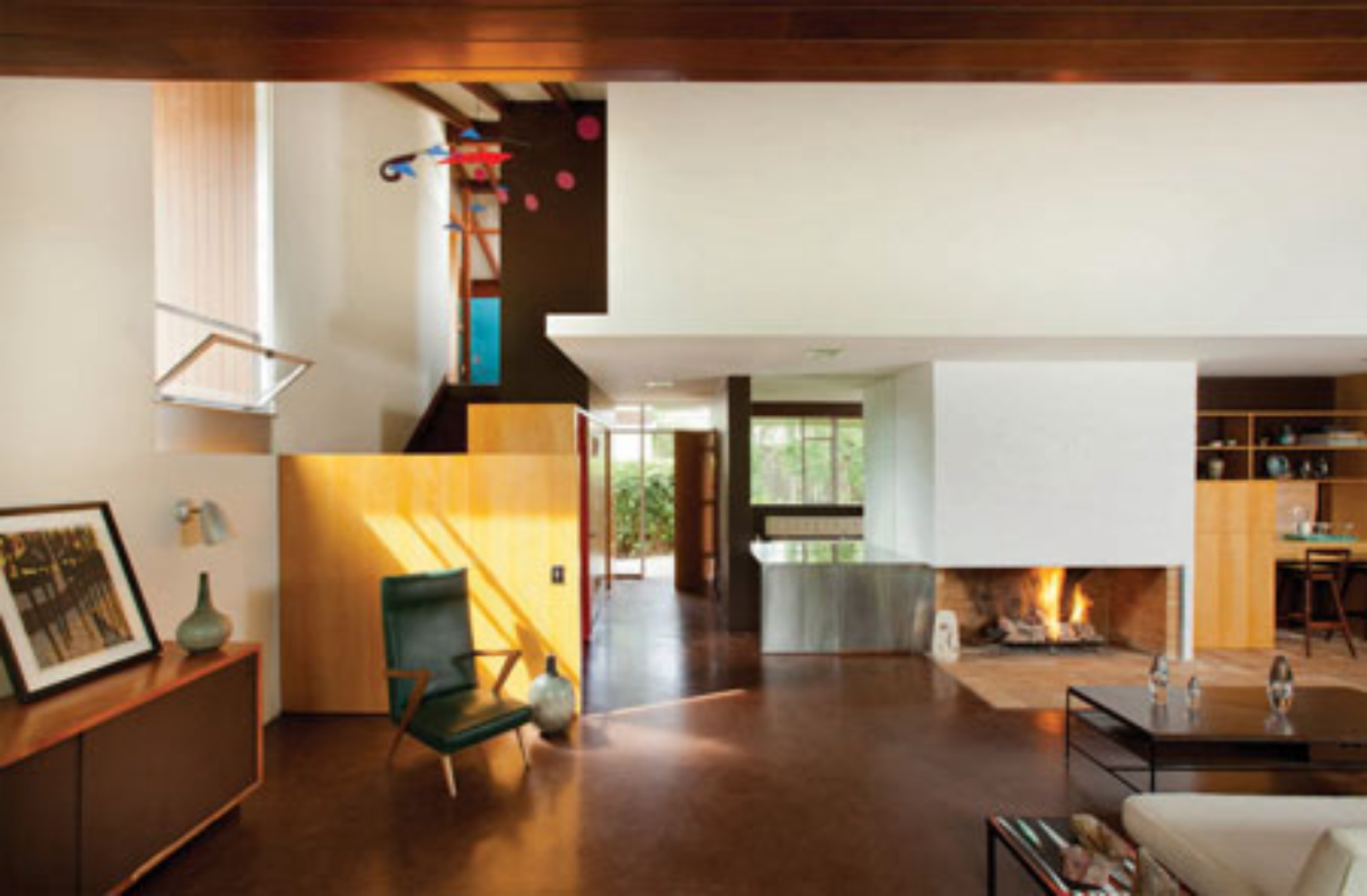 Conditions found at the house required significant restoration due to age, lack of maintenance and incompatible modifications. Neutra’s original palette of vivid colors, both outside and inside the house, had been covered; golden birch veneer had been recoated with dark stain. Tack strips from wall-to-wall carpet had damaged the rich, integrally colored concrete floor. Stone tile was installed over original concrete and brick floors.