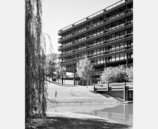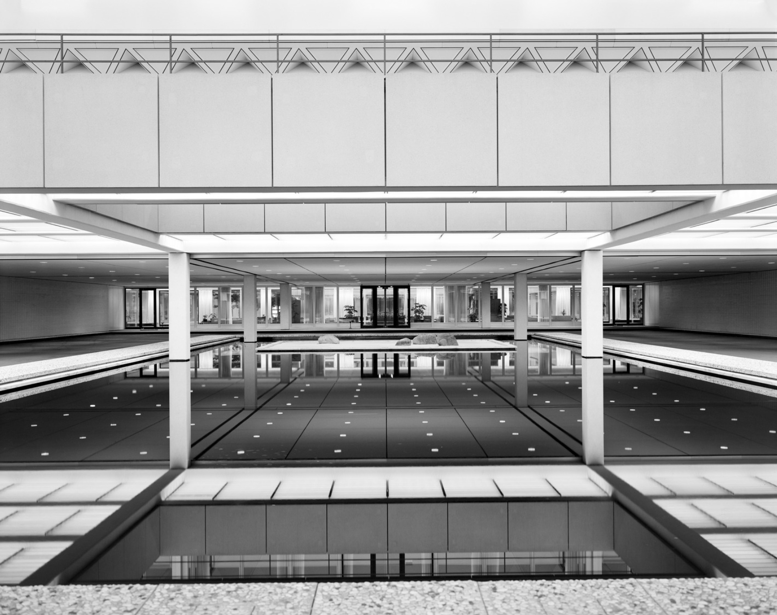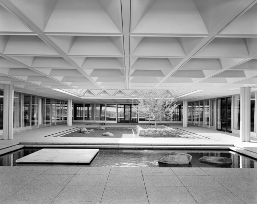 Postwar corporate campuses were an important proving ground for architects to demonstrate the core principles of modernist design: that form should follow function, and that the honest expression of building materials should put their inherent qualities on display. Because corporate campuses in this era were also seen as rural oases, set apart from their urban high-rise counterparts on large plots of land, landscape design played an essential role in the expression of place. In many cases, the architectural expression of a modernist corporate campus required that it borrow some drama from its surrounding landscape. And, in some cases, this meant bringing the outside in.