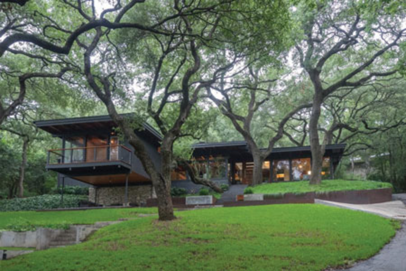 Roessner’s design at the Pohl House is elegant and innovative, yet family friendly. Like many mid-century Modernists, Roessner sought to integrate the house into its natural landscape and blur the division between indoor and outdoor spaces. Floor-to-ceiling windows combine with fir ceilings that extend out to the soffits, creating a feeling of openness throughout the home. Native stone on the lower portion of the exterior and on the fireplace help the house to feel like it rises up out of its hilly site on Balcones.