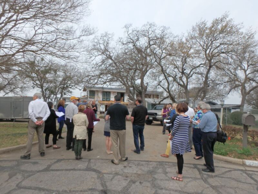 Designed in an unusual C-shaped plan, the front façade is accented with wood paneling and a Roman brick wainscot with a prominent brick chimney near the front entrance. The house at 2716 Merrimac Circle, currently undergoing renovations by Love, was constructed in 1966 and designed with an L-shaped footprint. Ema and Don Moes, the current owners, hosted the group for a walk-through tour, where Love explained how the house has been opened up on the interior while preserving original features such as the fireplace and expansive walls of glass. Refreshments and cocktails were served on the original triangular-shaped rear deck, featuring what must be one of Waco’s most spectacular views across the Ridgewood Country Club and golf course to Lake Waco. Thanks so much to Ema and Don for their gracious hospitality!