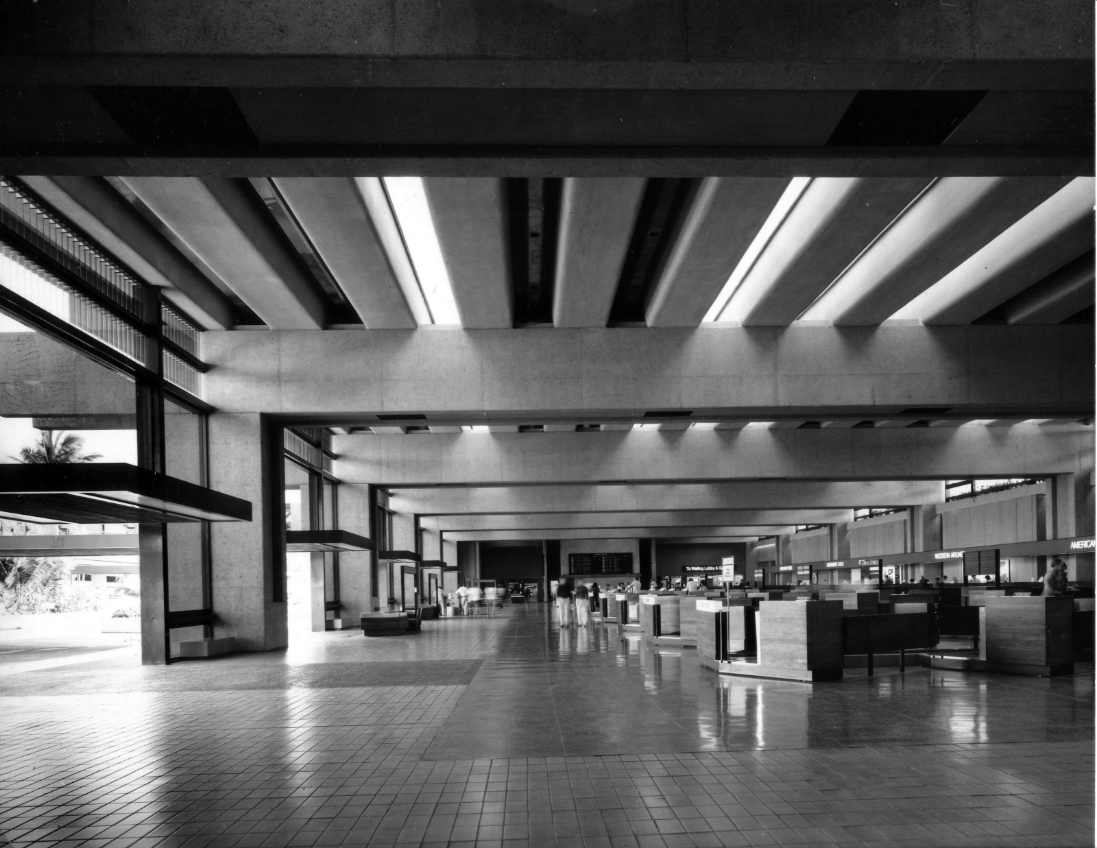 Ossipoff designed a permeable, bold, yet flexible and graceful structure that incorporated as many openings at its perimeter and ground planes as possible—with the exception of the ground-floor baggage claim area, there is no air-conditioning in the public areas of the ticketing and terminal departures lobby. His basic scheme raised Vierra’s terminal around the existing control tower to two stories, creating long bar-like structures fronted by new elevated passenger drop-off ramp at the second-floor departures ticketing area and the arrivals baggage-claim area below it. A series of open light wells divides the elevated passenger drop-off roadway from the two-story departures terminal and curbside drop-off canopy structure. This is a distinctive aspect of the design: palm trees spring from light wells between the departures terminal and roadway, and light and air are brought to the baggage and pickup area at the lower level. The terminal and roadway are linked by covered bridges. The intimate scale and shade of the bridges contrast with the large terminal facility, which, according to Ossipoff’s original design proposal, was to be illuminated naturally by continuous skylights running between the long-spanning beams in the terminal’s ceiling. This bold concept was not realized: only a few skylights from Vierra’s earlier hangar-like structure were retained, in the ceilings of Ossipoff’s renovated ticketing halls. Ossipoff’s linear plan allowed later expansions of the terminal to the east and west (executed by others).