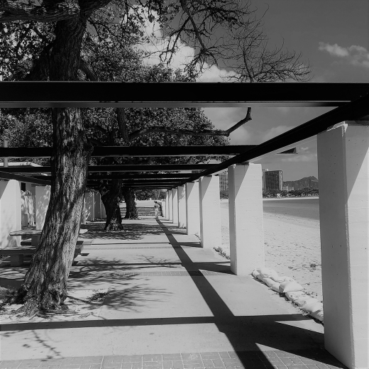 The lanai is thus a “non-building” structured by a grid of columns that carry either a low flat roof or an armature of exposed girders and beams overhead. The lanai building blends and harmonizes with existing topography, plant life, and setting; it is a structure of voids that highlights and frames views through and around it. Unlike Ossipoff’s most robust regionally distinct structures—such as the IBM Building and the iconic Robert Shipman Thurston, Jr., Memorial Chapel at Punahou School, which are more physically imposing and not as spatially porous—the lanai building is less an architectural object than a structural framework to be experienced before it can be fully understood.