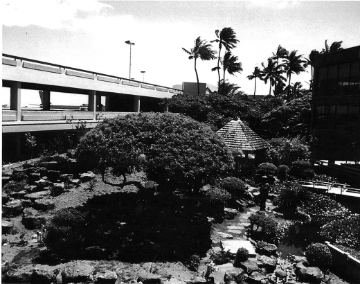 Tongg’s garden, which was near its maturity when Ossipoff encountered it, creates a condensed paradise of meandering paths that lead through varied tropical foliage, ponds, and a gazebo monument. The inclusion of the garden intensifies the lanai experience: it presents travelers with the beauty and variety of the Hawaiian landscape upon their arrival after a plane ride of five hours or more.