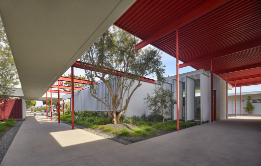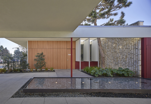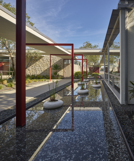 A Commercial Design Award of Excellence is presented to the Mariners Medical Arts Building in Newport Beach, California. Completed in 1961 by architect Richard Neutra, this trio of buildings was commissioned by a group of eleven doctors with a vision to create a medical clinic that was as welcoming and serene as it was functional. Neutra’s design successfully balanced these objectives, creating a space where nature’s calming influence and architectural clarity converge. At the heart of the complex is an open-air garden that serves as a tranquil “lobby” for the entire facility, providing a serene passage through lush tropical plants, reflecting pools, and asymmetrically laid walkways. With the help of 22 pages of the original building drawings and lots of photographs by Julius Schulman, the original paint colors were identified and matched as closely as possible in the restoration. The first floor was originally designed to be fully accessible, although no codes were in place at the time. Neutra’s wheelchair ramp was brought up to current day code. Significant care was taken to repair the iconic sun-shading elements, including the vertical aluminum louvers and wood trellises, ensuring they continue to perform their passive cooling functions. The original roof drainage system design had problems from the start and was completely remodeled to prevent flooding issues. The rejuvenation of the building’s water features – once drained and filled – reintroduces the soothing presence of water while incorporating safety improvements that reflect Neutra’s original terrazzo design.