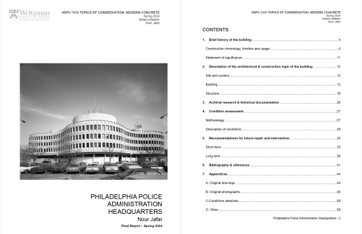 An Inventory/Survey Citation of Merit is given for Nour Jafar’s student research project on the Philadelphia Police Administration Building, also known as the “Roundhouse.” This paper is a notable contribution to the discourse on architectural preservation and social justice which surrounds the building. Jafar documents the technological advancements and material innovations that characterize the Roundhouse and engages critically with its fraught history as a site of violence and trauma. The paper explores the potential consequences of redevelopment, particularly its impact on surrounding communities, and proposes thoughtful conservation strategies that balance the building’s architectural significance with the need for reparative justice. By integrating historical documentation with contemporary social concerns, this research provides an essential resource for understanding the Roundhouse’s role in Philadelphia’s post-war architectural landscape and its ongoing significance.